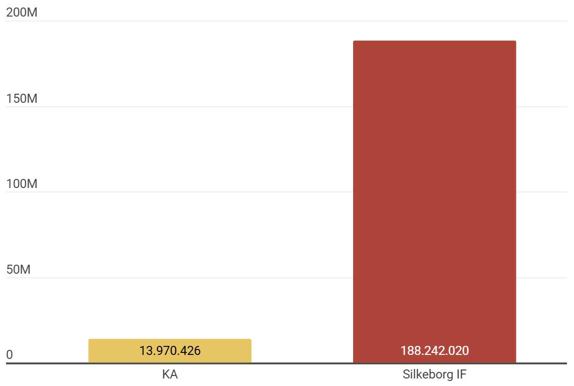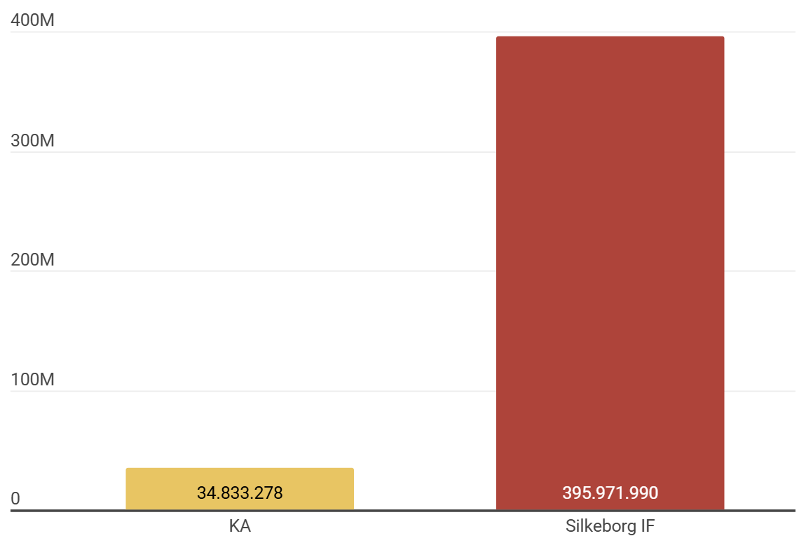 Tekjur Silkeborg eru 732,8% hærri en tekjur KA.