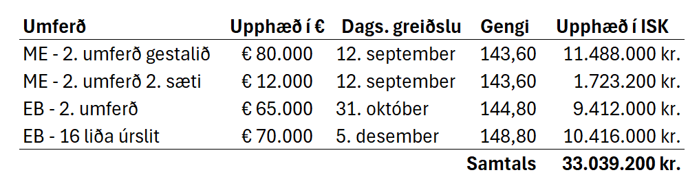 Næsti leikur Breiðabliks var í 16-liða úrslitum Evrópubikarsins en þar mættu þær danska liðinu Fortuna Hjörring og fengu fyrir vikið 70 þúsund evrur. Sú fjárhæð var greidd í gær. Miðað við evrugengi gærdagsins þá fékk Breiðablik 10.416.000 krónur. Það kemur sér vel fyrir Breiðablik að krónan hefur veikst um 2,8% gagnvart evrunni frá síðustu greiðslu fyrir tæpum mánuði síðan.
