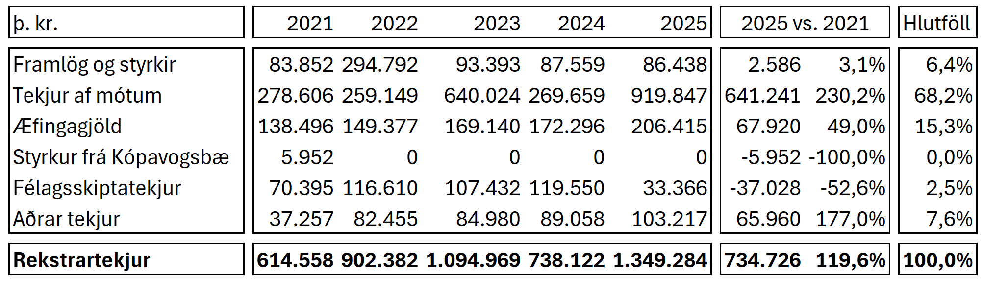 Rekstrartekjur Breiðabliks voru 1.349 milljónir króna á síðasta ári, en ekkert félag hefur velt jafnmiklum pening á einu ári. Árið áður voru tekjur Breiðabliks 738 milljónir og því er um að ræða 82,8% hækkun á milli ára. Þessa tekjuaukningu má rekja til tekna af Evrópukeppnum, en bæði karla- og kvennaliðið náðu góðum árangri þar. Tekjur af mótum voru 920 milljónir króna árið 2025 samanborið við 270 milljónir króna árið áður, 241% aukning á milli ára. Þetta var langstærsti tekjuliður Breiðabliks á síðasta ári en rúmlega tveir þriðjungar af tekjum þeirra voru tekjur af mótum.