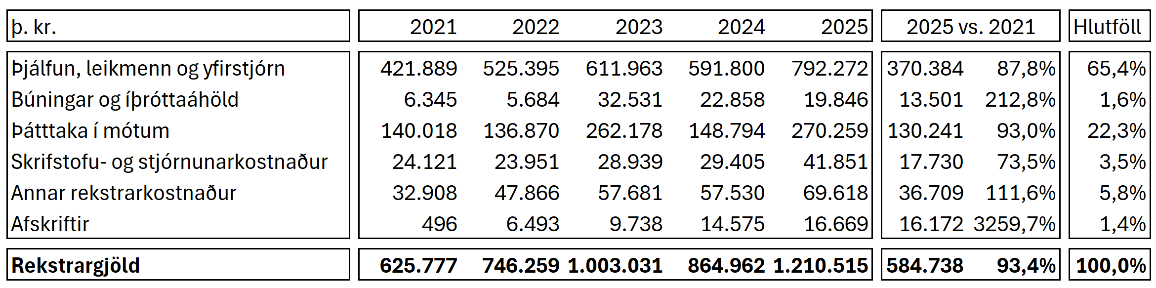 Rekstrargjöld Breiðabliks voru 1.210 milljónir króna á síðasta ári, en ekkert félag hefur verið með jafnhá útgjöld á einu ári. Árið áður voru útgjöld Breiðabliks 865 milljónir króna og því jukust útgjöld um 40% á milli ára. Stærsti útgjaldaliður Breiðabliks á síðasta ári var liðurinn þjálfun, leikmenn og yfirstjórn. Undir þessum lið falla meðal annars launagreiðslur Breiðabliks. Rúmlega 65% af útgjöldum Breiðabliks fóru í þennan útgjaldalið. Næststærsti útgjaldaliður Breiðabliks er vegna þátttöku í mótum sem nam 270 milljónum króna á síðasta ári.