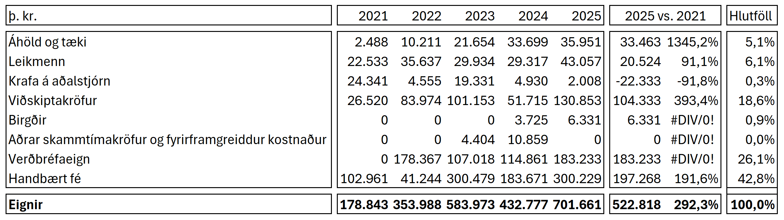 Eignir Breiðabliks námu 701 milljón króna á síðasta ári og hækkuðu um 62% á milli ára. Eignir Breiðabliks vaxið töluvert mikið frá því sem var árið 2021, eða tæplega fjórfaldast á þeim tíma. Stærsta einstaka eign Breiðabliks er handbært fé sem stóð í 300 milljónum króna í árslok 2025. Þar á eftir er verðbréfaeign félagsins næststærsta eignin, en félagið var með 183 milljónir króna í verðbréfum í lok síðasta árs.