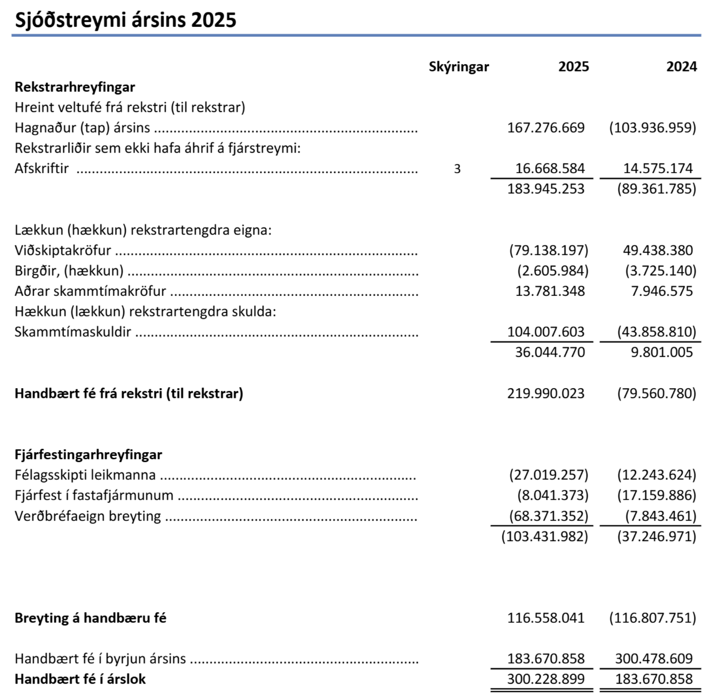 Handbært fé Breiðabliks var 300 milljónir króna í árslok 2025 og hækkaði um 116 milljónir króna á milli ára. Ef litið er á sjóðstreymið má sjá að töluverður munur er á milli rekstrarhreyfinganna á milli ára. Handbært fé til rekstrar voru 80 milljónir króna árið 2024 en á síðasta ári var handbært fé frá rekstri 220 milljónir króna og því um að ræða tæplega 300 milljón króna sveiflu á milli ára. Í fjárfestingarhreyfingum Breiðabliks má svo sjá að félagið eyddi 27 milljónum króna í kaup á leikmönnum.