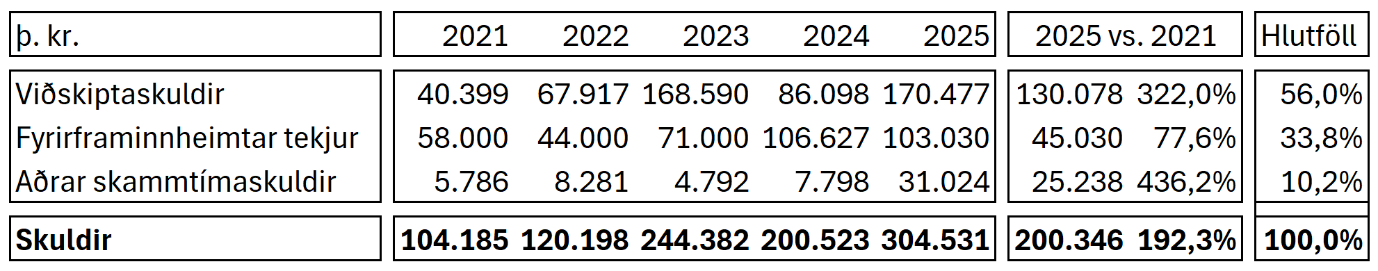 Skuldir Breiðabliks námu 304 milljónum króna í árslok 2025 og hækkuðu um rúmlega 104 milljónir króna á milli ára. Tæplega 170 milljónir króna af skuldum Breiðabliks eru viðskiptaskuldir.