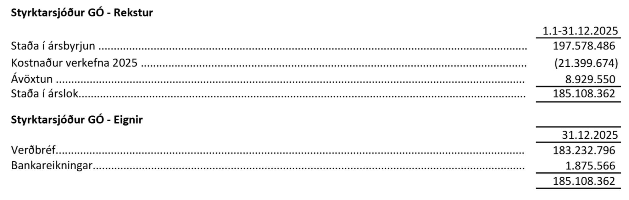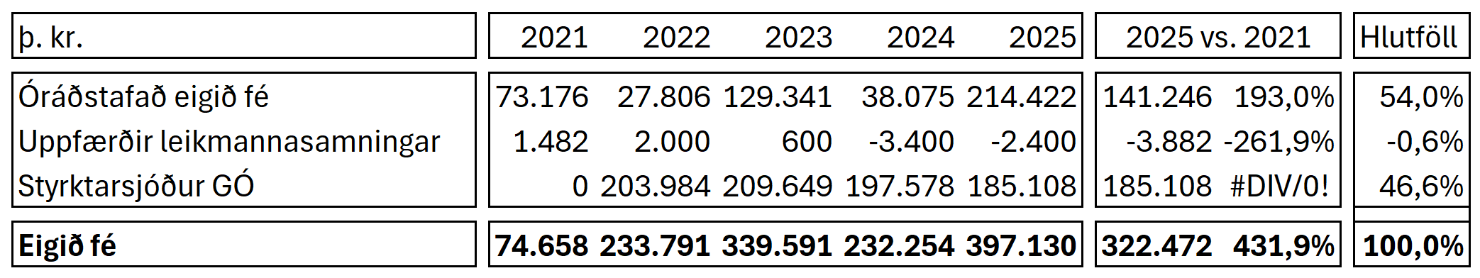 Eigið fé Breiðabliks stóð í 397 milljónum króna í árslok 2025. Stærsti hluti þess er óráðstafað eigið fé sem var 214 milljónir króna en þar á eftir er styrktarsjóður Guðmundar Eggerts Óskarssonar stór hluti af eigið fé Breiðabliks. Guðmundur arfleiddi félaginu 200 milljónir króna árið 2022. Í skýringum ársreikningsins má sjá að á árinu var 21 milljónum króna eytt í verkefni. Stærsti hluti af peningnum sem Guðmundur arfleiddi er í verðbréfum, tæplega 183 milljónir króna, en auk þess eru ríflega 2 milljónir króna á bankabók.
