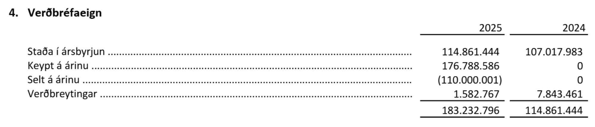 Í lok skýringum ársreikningsins má sjá að í byrjun árs 2025 nam verðbréfaeign Breiðabliks tæplega 115 milljónum króna. Á árinu keypti Breiðablik þó verðbréf fyrir næstum því 177 milljónir króna og seldi verðbréf fyrir samtals 110 milljónir króna.