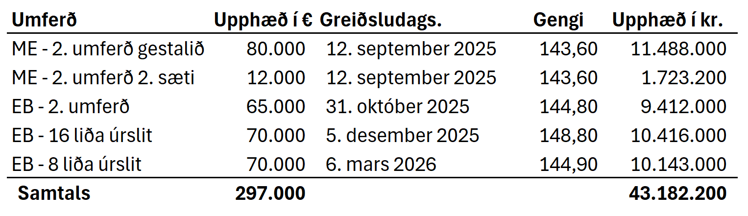 Kvennaliðið komst alla leið í 8-liða úrslit Evrópubikarsins og fær hátt í 43 milljónir króna samtals. Tæplega fjórðungur þeirrar fjárhæðar var þó greiddur út í byrjun mars 2026, tæplega 10 milljónir króna.
