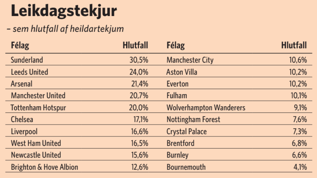 Hlutfall leikdagstekna af rekstrartekjum er hæst hjá nýliðunum í Sunderland, þar sem það er 30,5%. Nýliðar Leeds United fylgja á eftir þeim með 24,0%. Á eftir nýliðunum tveimur koma síðan fimm af stóru sex liðunum en það eru Arsenal, Manchester United, Tottenham Hotspur, Chelsea og Liverpool. Hlutfall leikdags-