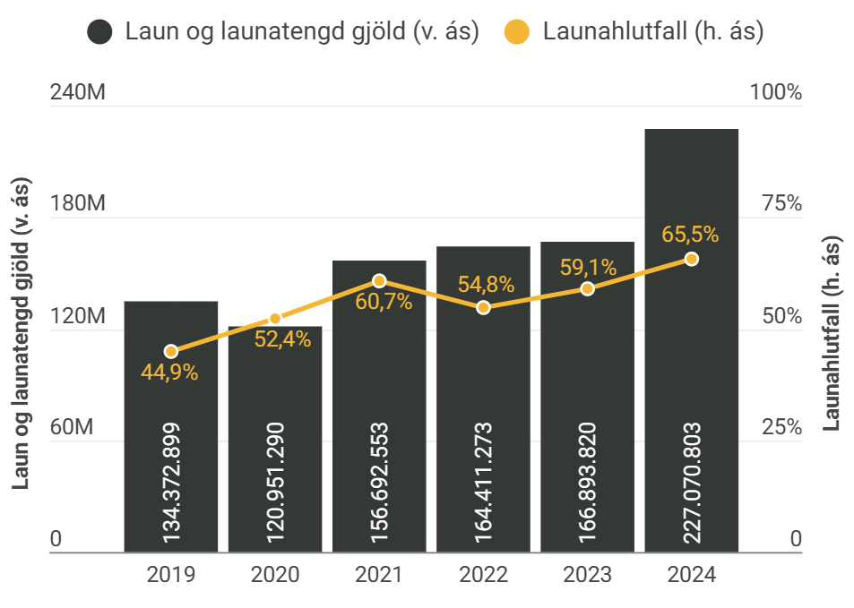 Launakostnaður KR hefur farið vaxandi síðustu árin og hlutfall þess af rekstrartekjum var 65,5% árið 2024. Nær allur launakostnaðurinn eru verktakagreiðslur en einungis 1 stöðugildi er hjá knattspyrnudeild KR sem er þá væntanlega framkvæmdastjóri knattspyrnudeildarinnar.