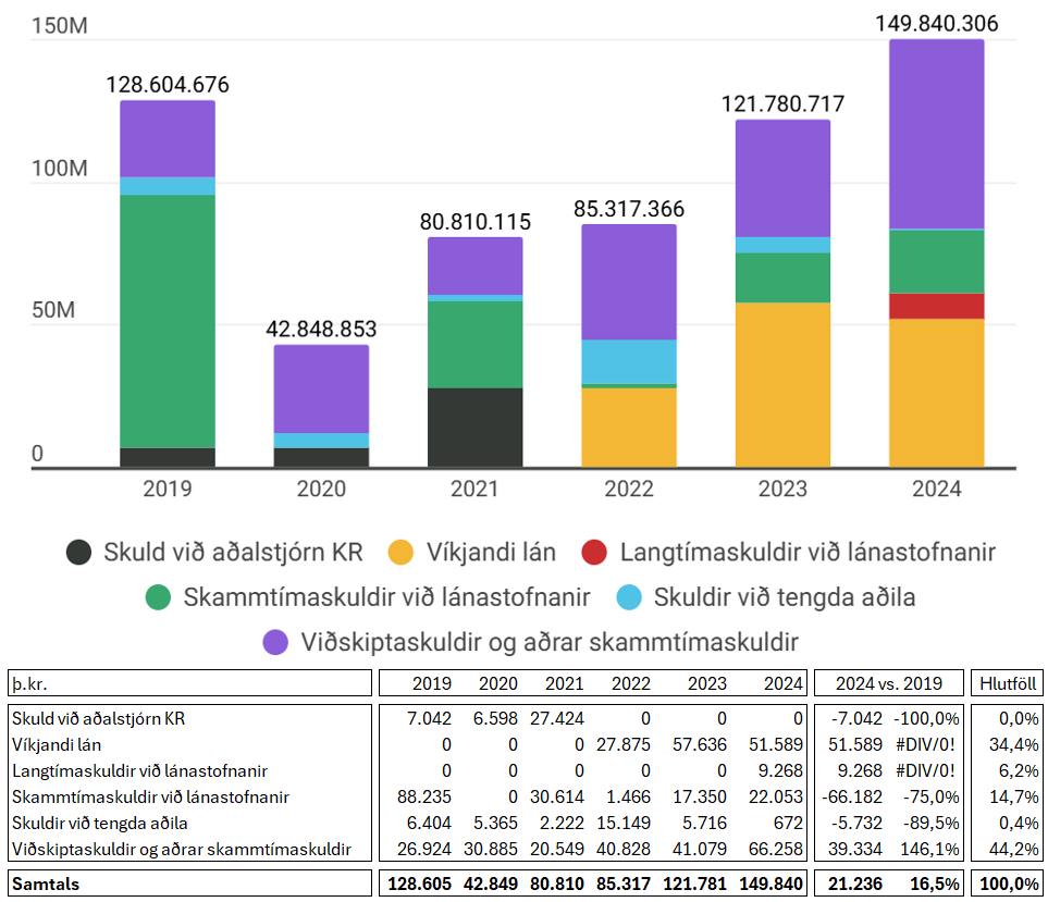 Skuldir KR hafa hækkað síðustu árin og stóðu í tæpum 150 milljónum kr. á síðasta ári. Stærsti hluti þess eru viðskiptaskuldir og víkjandi lán. Þá var hlutfall skulda af eignum 150,8% í árslok 2024 en það lækkaði þó á milli ára. Knattspyrnudeild KR tók óverðtryggt langtímalán á síðasta ári en árlegar afborganir af því eru tæplega 1,1 milljón króna. Þar að auki er KR með yfirdrátt upp á rúmlega 21 milljón króna en hann hækkaði um 3,7 milljónir króna á milli ára. Skuldastaða knattspyrnudeildarinnar er því ekki í frábærum málum.