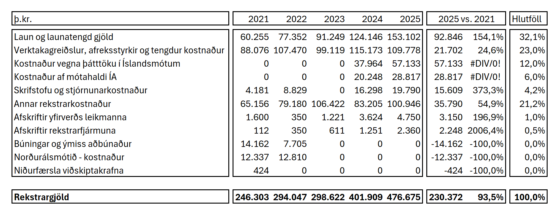 Laun og launatengd gjöld ÍA hafa vaxið verulega frá árinu 2021, en vöxturinn nemur 154,1%. Vöxturinn á verktakagreiðslum, afreksstyrkjum og tengdum kostnaði hefur þó vaxið töluvert hægar, allt að 24,6%.
