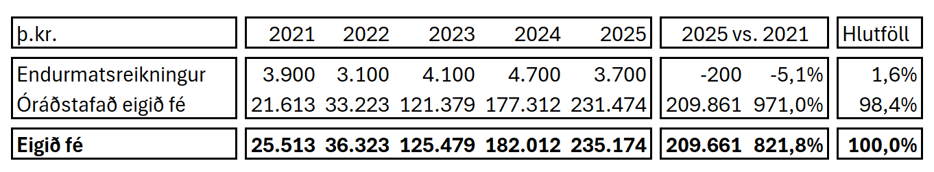 Eigið fé ÍA hækkaði um 53,1 milljónir króna á milli ára og stóð í 235,2 milljónum króna í árslok 2025. Eigið fé ÍA hefur hækkað um 971% frá árinu 2021 sem er stjarnfræðilega mikill vöxtur. Eina knattspyrnufélagið með meiri vöxt á eigið fé sínu en þetta er Víkingur sem er með 1294% vöxt frá 2021-2024.