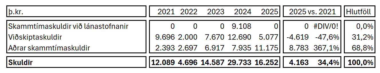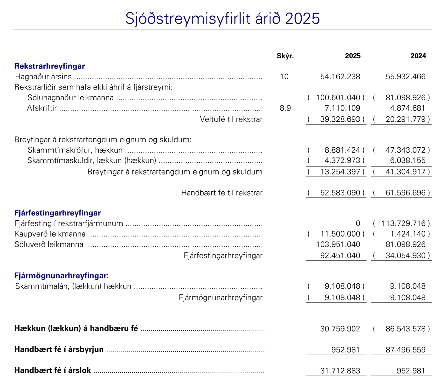 Skuldir ÍA lækkuðu um 13,5 milljónir króna á milli ára og stóðu í 16,3 milljónum króna í árslok 2025. Félagið greiddi niður 9 milljón króna yfirdrátt sem var tekinn árið 2024. Eins og staðan er í dag þá nær handbært fé ÍA að dekka af allar skuldir félagsins, sem er vel af sér vikið.