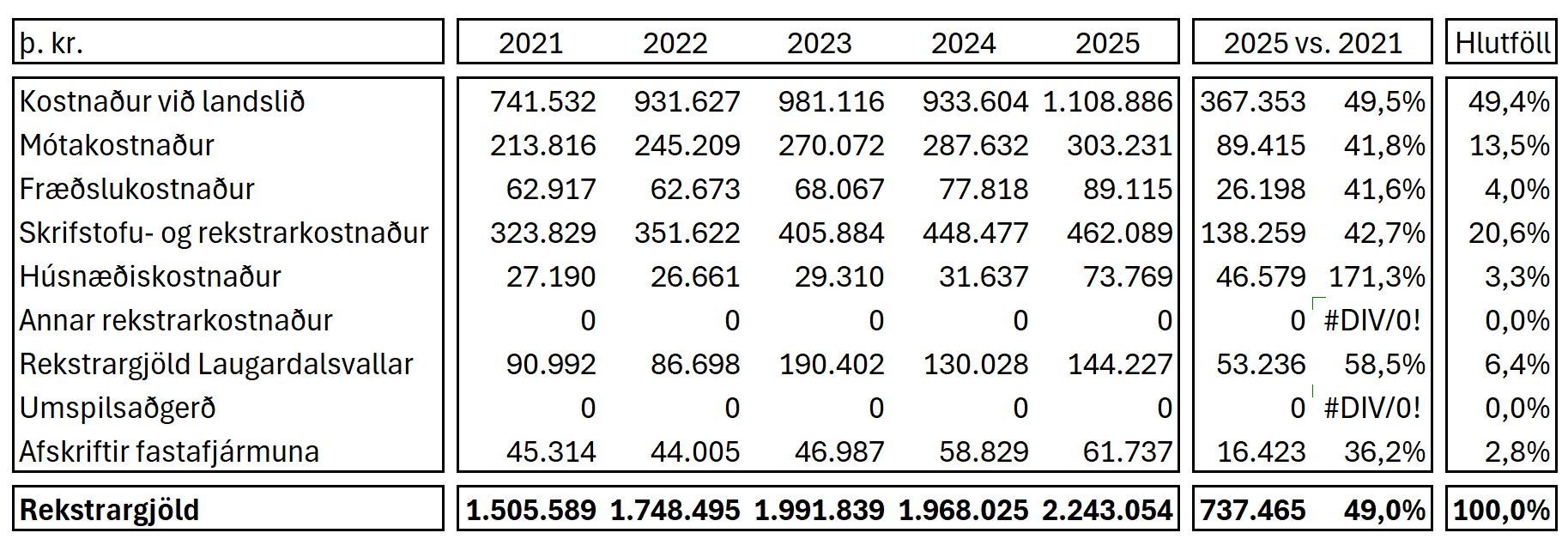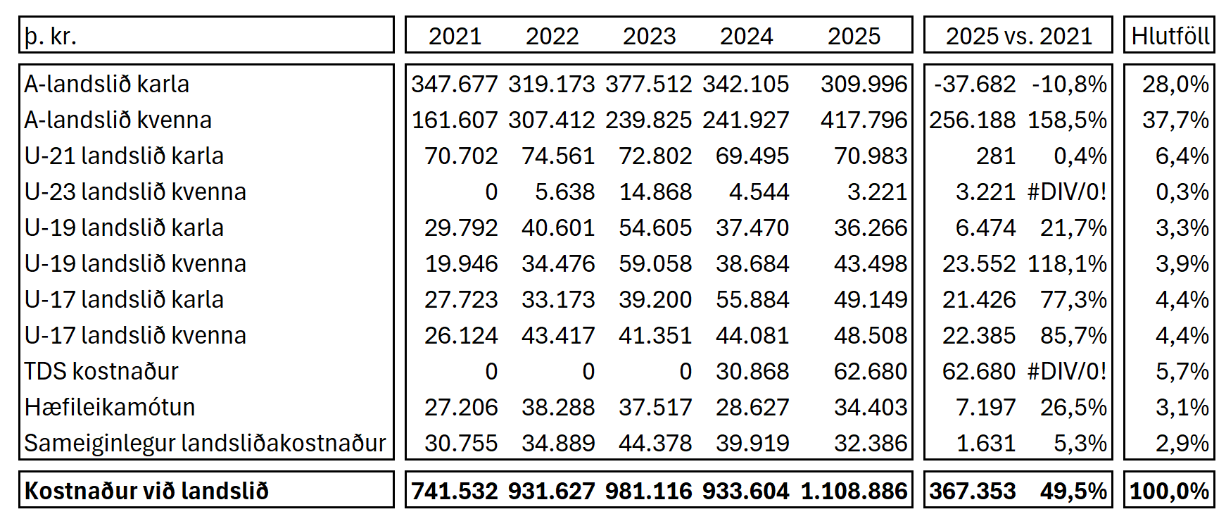Kostnaður KSÍ vegna mótahalds var samtals 303 milljónir króna árið 2025 og hækkaði um 15,6 milljónir króna á milli ára, sem er hækkun upp á 5,4%. Þessi útgjaldaliður nemur 13,5% af heildarútgjöldum KSÍ. Á síðasta ári fóru fram 6.195 KSÍ leikir og meðalkostnaðurinn á leik er því rétt undir 49 þúsundum króna.