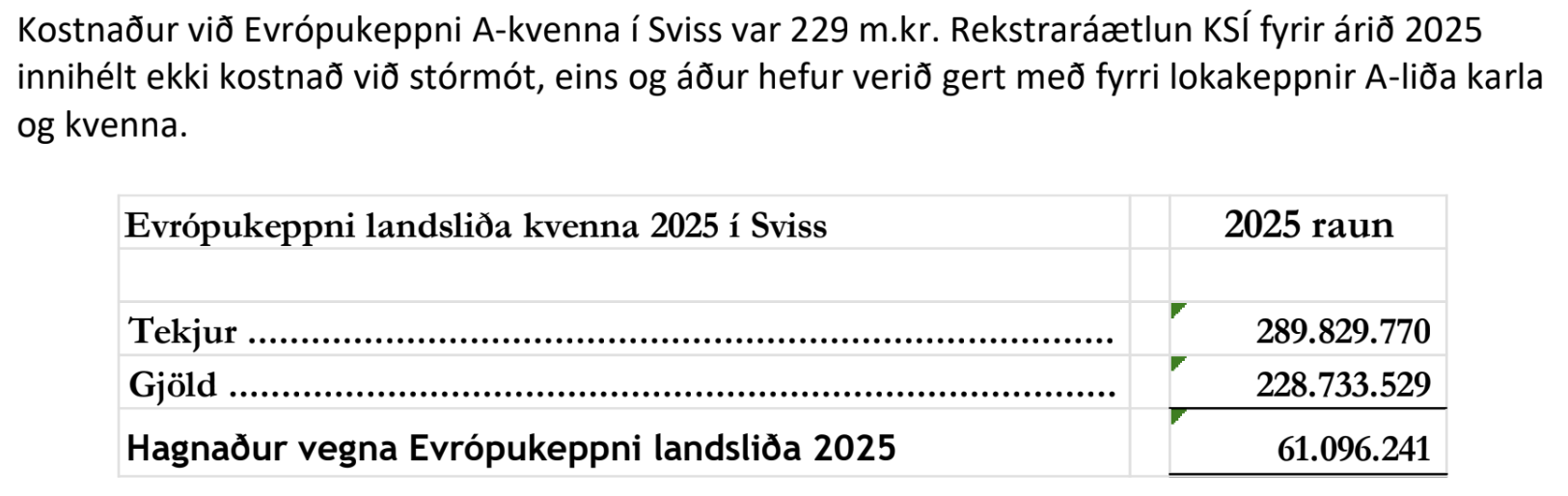 Áætlanir KSÍ gerðu ráð fyrir því að kostnaður við landslið myndu vera 949 milljónir króna en voru í raun 1.108 milljónir króna í árslok 2025, 16,8% umfram áætlun. Í greinargerð sem fylgdi með ársreikningnum kemur fram að ástæðan fyrir þessu er sú að kostnaður við þátttöku A-landsliðs kvenna á EM 2025 var ekki tekinn með inn í rekstraráætlun KSÍ fyrir árið 2025. Það er athyglisvert þar sem kvennalandsliðið tryggði sér þátttökurétt á EM sumarið 2024. Þá gerði rekstraráætlunin heldur ekki ráð fyrir tekjum af EM. Samkvæmt greinargerðinni var kostnaður við þátttöku á mótinu samtals 229 milljónir króna en tekjurnar voru þó nokkuð hærri, ríflega 290 milljónir króna, og því græddi KSÍ 61 milljón króna af þessu móti.