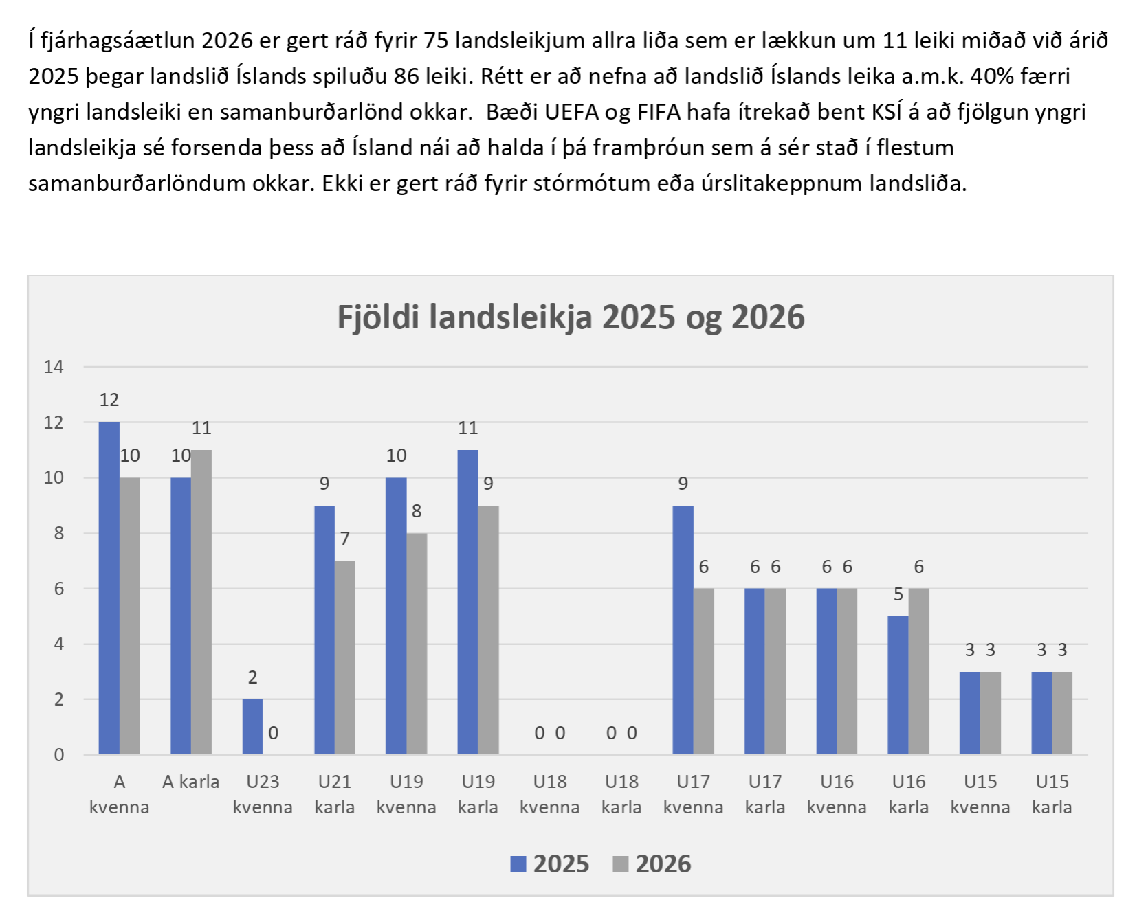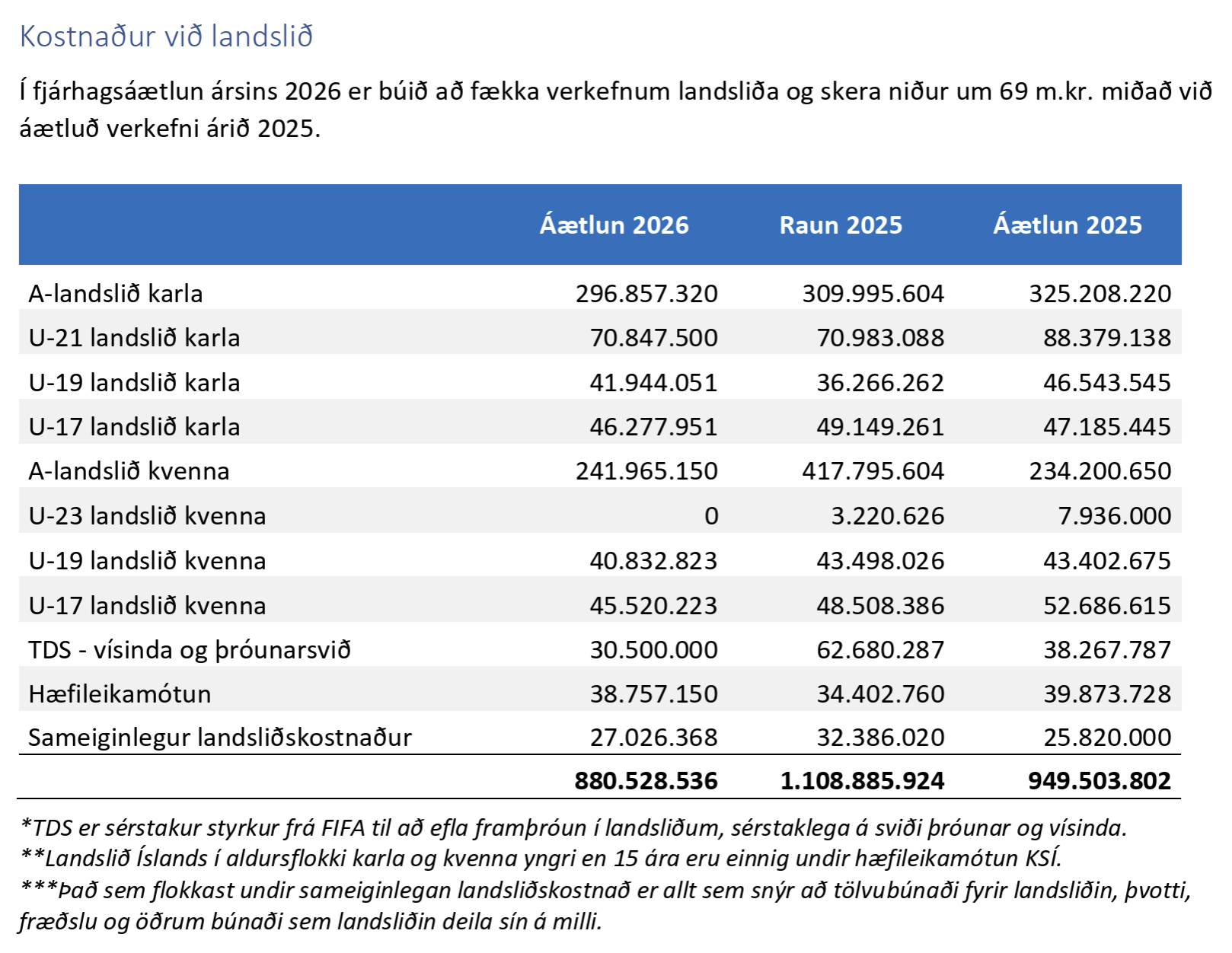 KSÍ gerir ráð fyrir því að rekstrargjöldin verði 1.914 milljónir króna á næsta ári. Það er 14,7% lækkun á milli ára en ástæðuna má einna helst rekja til lægri kostnaðar við landslið. Kostnaðurlækkunin nemur 228 milljónum króna og er aðallega vegna lægri kostnaðar við A-landslið kvenna, sem keppti auðvitað á EM sumarið 2025.