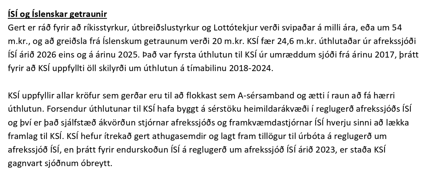 KSÍ gerir ráð fyrir því að fá 20 milljónir króna frá Íslenskum getraunum sem er svipuð upphæð og knattspyrnusambandið fékk árið 2024 og 2025. KSÍ fær síðan 24,6 milljónir króna úr afrekssjóði ÍSÍ árið 2026, líkt og á síðasta ári. Í greinargerðinni kvartar KSÍ sáran undan því að hafa ekki fengið úthlutað úr þessum sjóði á árunum 2018-2024, þrátt fyrir að hafa uppfyllt öll skilyrði um úthlutun. Þá bendir KSÍ á, að þrátt fyrir úthlutunina í ár og í fyrra, að þá ætti úthlutunin þar að auki að vera í raun hærri. Sérstakt heimildarákvæði í reglugerð afrekssjóðs ÍSÍ gerir þeim kleift að lækka framlag sitt til KSÍ. Þegar fjárhagsstaða annarra sérsambanda er skoðuð þá er ljóst að þörfin er ekki eins mikil hjá KSÍ. Efnahagsreikningurinn hjá KSÍ er í fínum málum, sem er ekki raunin hjá sumum sérsamböndum. Þar að auki hefur líklega ekkert annað sérsamband jafn góð tækifæri og möguleika á tekjuöflun og KSÍ. Knattspyrnusambandið þarf ekki að bregða sér í líki Óliver Tvist.