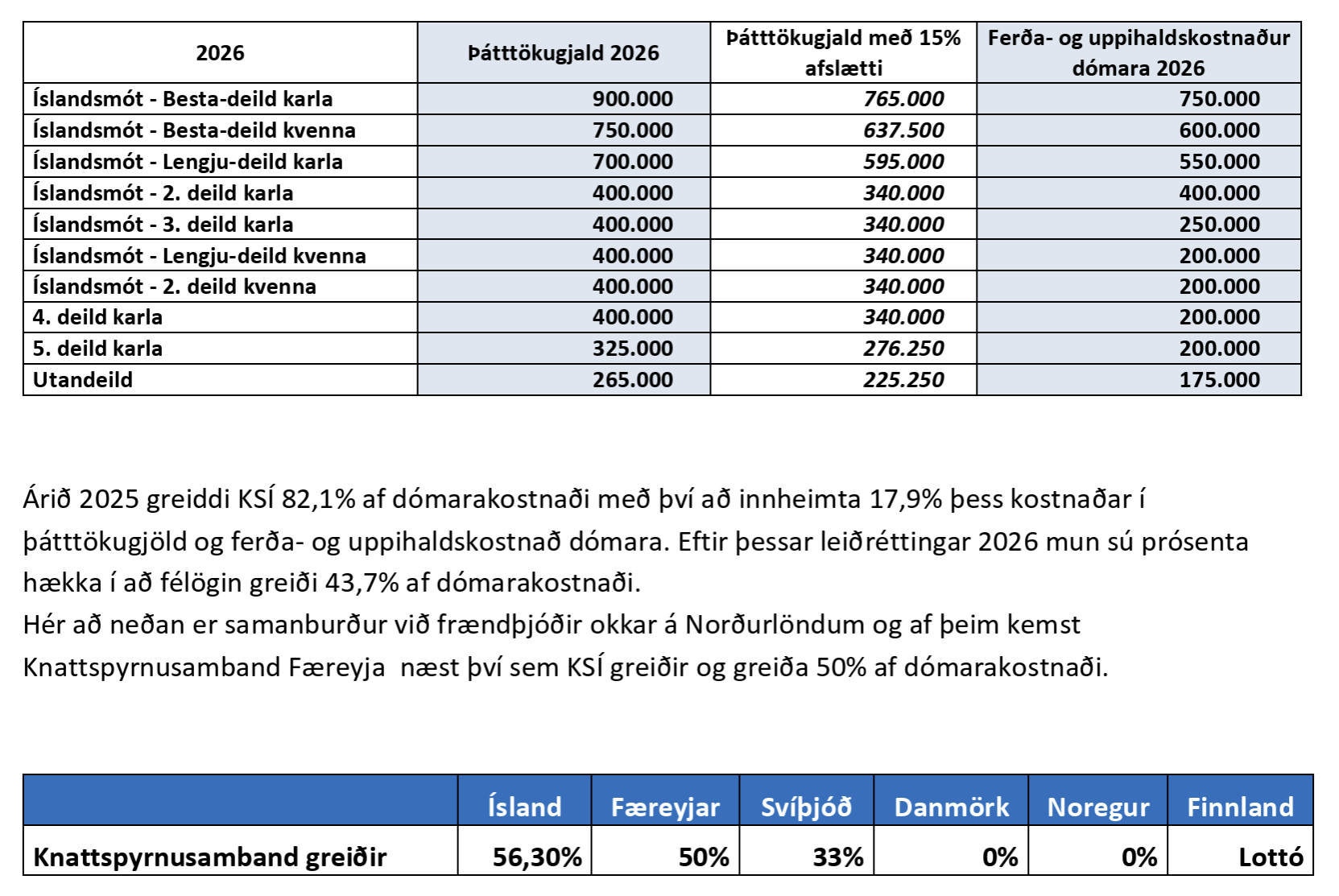 Mikið hefur verið rætt að undanförnu um hækkandi álögur á aðildarfélögin fyrir þátttöku þeirra á Íslandsmótinu. KSÍ gerir ráð fyrir því að aðildarfélög KSÍ greiði 40 milljónir króna í ferða- og uppihaldskostnað dómara, auk 67 milljónir króna í þátttökugjöld í Íslandsmót, Mjólkurbikar, bikarkeppni neðri deilda félaga og Lengjubikar karla og kvenna. Þetta gera því samtals 107 milljónir króna sem aðildarfélögin þurfa að bera kostnaðinn af. KSÍ bendir á í greinargerðinni sinni að með þessu muni knattspyrnusambandið greiða 56,3% af dómarakostnaðinum. Einnig fylgir með samanburður af hinum Norðurlöndunum þar sem sjá má að hlutfallið er það hæsta sem knattspyrnusamband greiðir. Færeyska knattspyrnusambandið greiðir 50%, sænska knattspyrnusambandið greiðir 33% og í hinum löndunum greiðir knattspyrnusambandið ekkert.