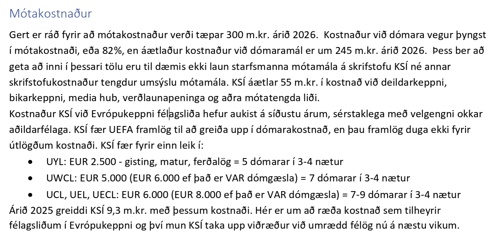 Það kemur fram í greinargerðinni að árangur íslenskra félagsliða í Evrópukeppnum hafi raun reynst KSÍ ákveðinn baggi. Það er vegna þess að KSÍ sér um að greiða fyrir dómarakostnaðinn við þessa leiki. KSÍ fær framlög frá UEFA til þess að mæta þessum kostnaði, en dugir þó ekki til. Fyrir leiki í Evrópukeppni unglingaliða fær KSÍ 2.500 evrur sem á að fara í að greiða gistingu, mat og ferðalög fimm dómara í þrjár til fjórar nætur. Fyrir leiki í Meistaradeild kvenna fær KSÍ 5.000 evrur, eða 6.000 evrur ef það er VAR dómgæsla, til þess að greiða gistingu, mat og ferðalög sjö dómara í þrjár til fjórar nætur. Fyrir leiki í Evrópukeppnum karla fær KSÍ 6.000 evrur, eða 8.000 evrur ef það er VAR dómgæsla, til þess að greiða gistingu, mat og ferðalög sjö til níu dómara í þrjár til fjórar nætur.