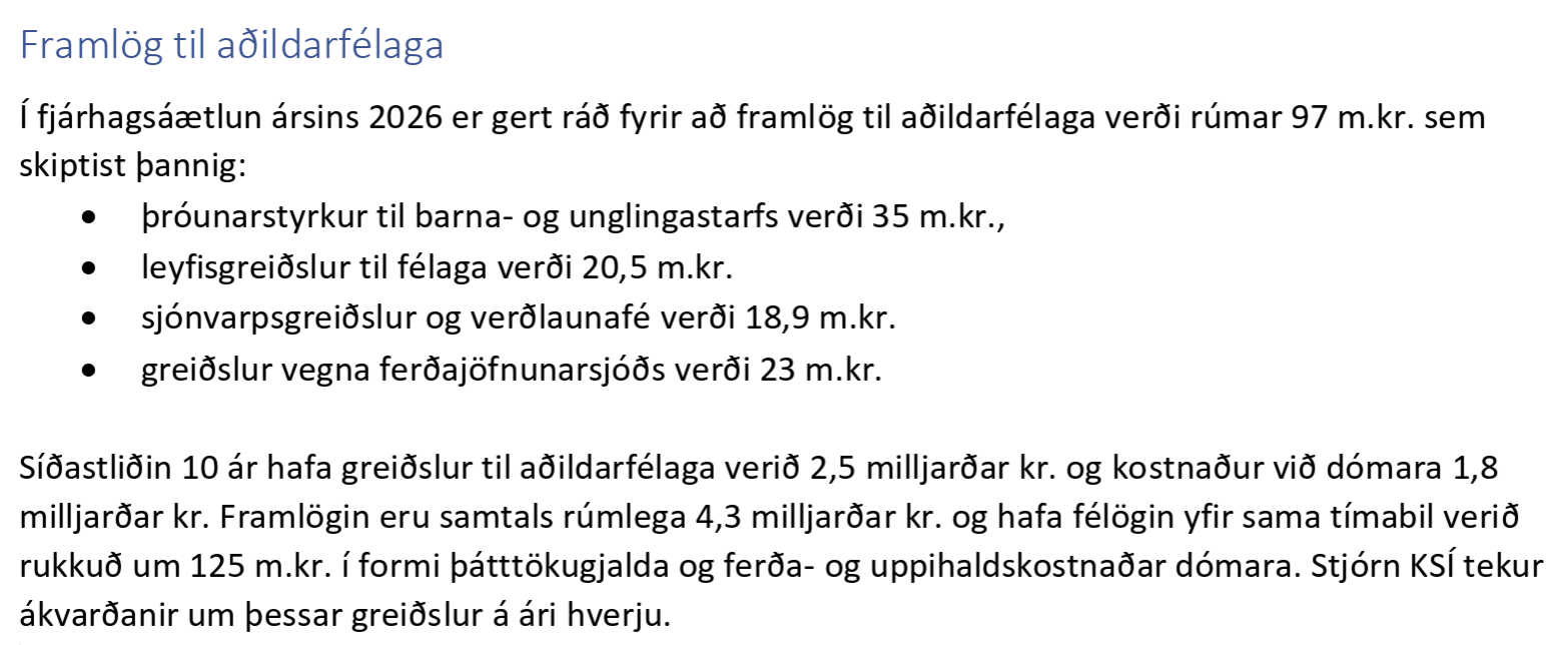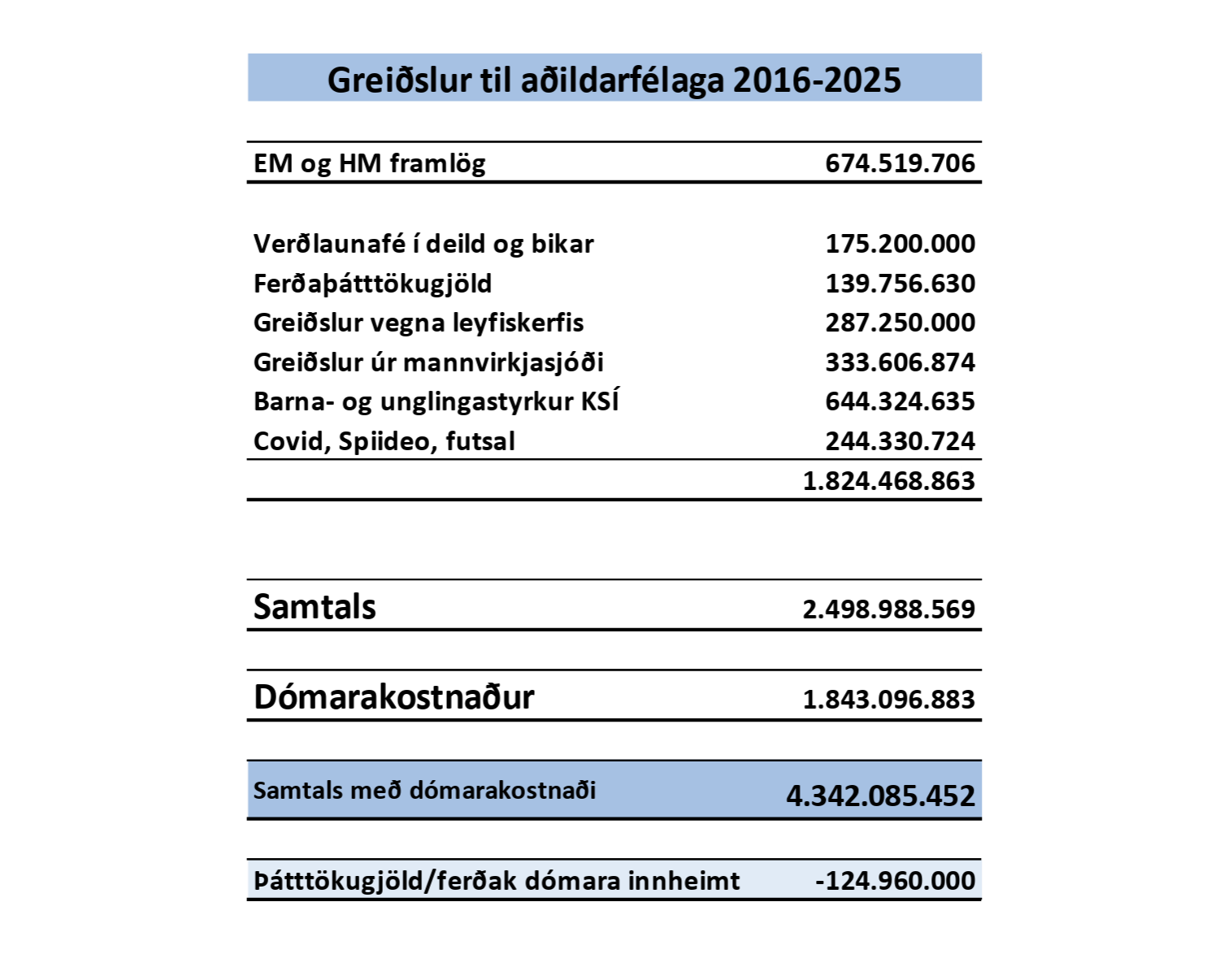 KSÍ gerir ráð fyrir því að greiða 97 milljónir króna til aðildarfélaganna á þessu ári samanborið við hátt í 107 milljónir króna á síðasta ári. Á það er bent að á síðastu tíu árum hafa aðildarfélögin fengið samtals 2.499 milljónir króna ráðstafað frá KSÍ auk 1.843 milljónir sem dómarakostnaður hefur verið. Á þeim tíma hafa aðildarfélögin einungis verið rukkuð um 125 milljónir króna af KSÍ í formi þátttökugjalda og ferða- og uppihaldskostnaðar dómara.