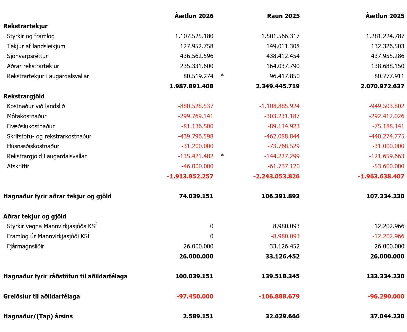 Samhliða ársreikningnum birti KSÍ fjárhagsáætlun fyrir árið 2026. Þar er gert ráð fyrir því að rekstrartekjur KSÍ verði 1.988 milljónir á árinu, 361 milljón krónum lægri rekstrartekjur en árið 2025. Helsta ástæðan fyrir lægri rekstrartekjum er vegna tekjuliðarins Styrkir og framlög, sem gert er ráð fyrir því að verði 1.107 milljónir króna í ár samanborið við 1.501 milljónir króna. Greiðslur frá UEFA falla meðal annars undir þennan tekjulið. Þar munar til dæmis um greiðslur vegna þátttöku A-landsliðs kvenna á EM 2025, en framlög UEFA vegna þess voru 290 milljónir króna.