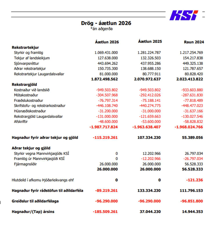 KSÍ sér fram á 185 milljón króna taprekstur árið 2026