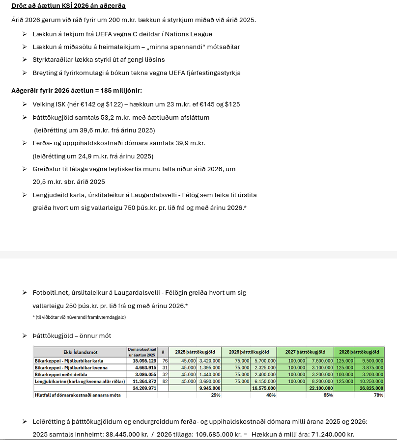 Ef ekki verður ráðist í aðgerðir gerir KSÍ ráð fyrir því að tap verði af rekstrinum sem nemi tæplega 185 milljónum króna. Miðað við áætlun ársins 2025 er gert ráð fyrir því að sambandið muni skila hagnaði upp á 37 milljónir króna. Ef við horfum yfir fimm ára tímabil, þ.e. 2021-2026, má sjá að afkoma ársins 2026 er sú lægsta á umræddu tímabili, að því gefnu að ekki verði ráðist í aðgerðir. Uppsafnað tap á þessu fimm ára tímabili nemur rúmlega 103 milljónum króna, en þó hefur rekstrarafkoman verið jákvæð upp á tæpar 289 milljónir króna á þessu tímabili.