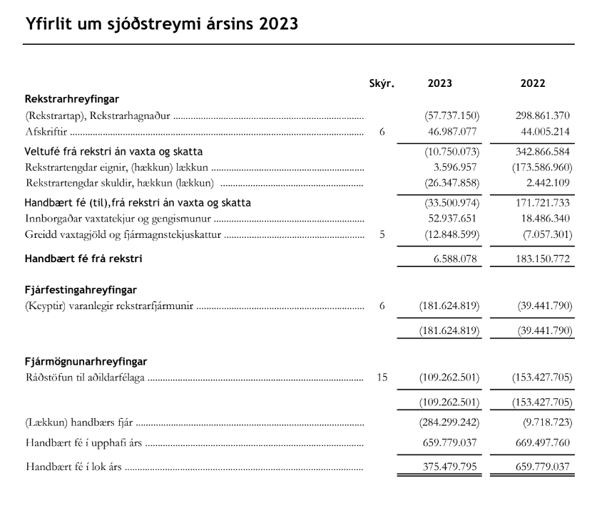 Í árslok 2024 nam handbært fé KSÍ samtals 346,5 milljónum króna, en gengið var verulega handbæra féð árið 2023 þegar það lækkaði um 284 milljónir króna. Það ár var KSÍ rekið með tapi upp á tæplega 127 milljónir króna. Ef litið er á sjóðstreymið frá því ári má sjá að lækkun handbærs fjár má rekja að miklu leyti til kaupa á varanlegum rekstrarfjármunum upp á ríflega 182 milljónir króna. Þá sést einnig í sjóðstreyminu að handbært frá rekstri árið 2023 var jákvætt um 6,6 milljónir króna sem gefur til kynna að reksturinn sjálfur hafi verið í fínum skorðum. Það sem vó þungt þar voru afskriftir sem námu 47 milljónum króna og fjármagnsliðir sem voru jákvæðir upp á tæpa 41 milljón króna. Fyrir árið 2026 gerir áætlun KSÍ ráð fyrir því að afskriftir nemi 48,6 milljónum króna. Ef þessar afskriftir eru teknar út fyrir sviga er rekstrarafkoma (EBITDA) KSÍ neikvæð upp á 66 milljónir króna. Þá gerir KSÍ ráð fyrir því að fjármagnsliðir verði jákvæðir upp á 26 milljónir króna árið 2026.