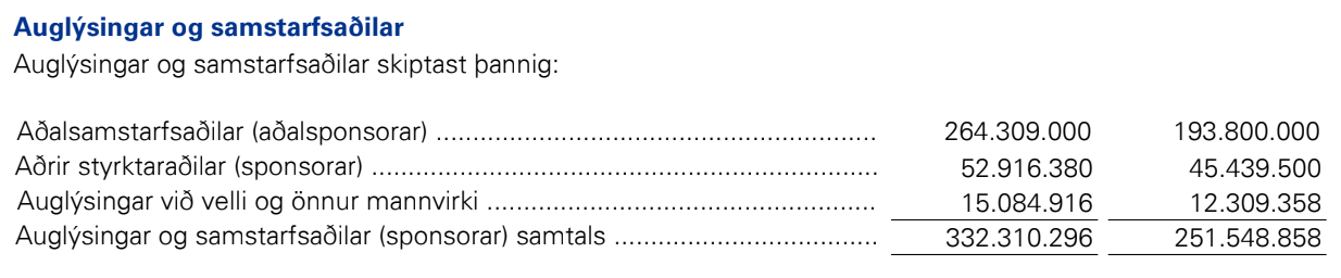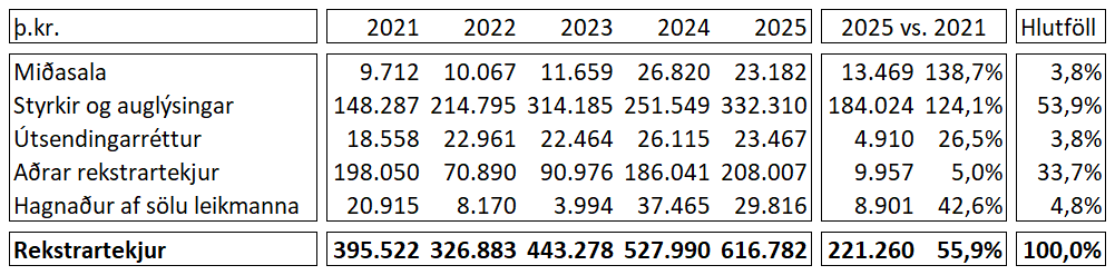 Rekstrartekjur Vals voru 616,8 milljónir króna á síðasta ári og hækkuðu um rúmlega 88,8 milljónir á milli ára, eða sem nemur 16,8% hækkun. Stærsti tekjuliðurinn hjá Val á síðasta ári voru styrkir og auglýsingar. Sá tekjuliður var 53,9% af öllum rekstrartekjum þeirra. Í skýringum er sá tekjuliður sundurliðaður og þar má sjá að sá peningur kemur að mestu leyti frá aðalsamstarfsaðilum, eða rúmlega 264 milljónir af 332 milljónum króna.