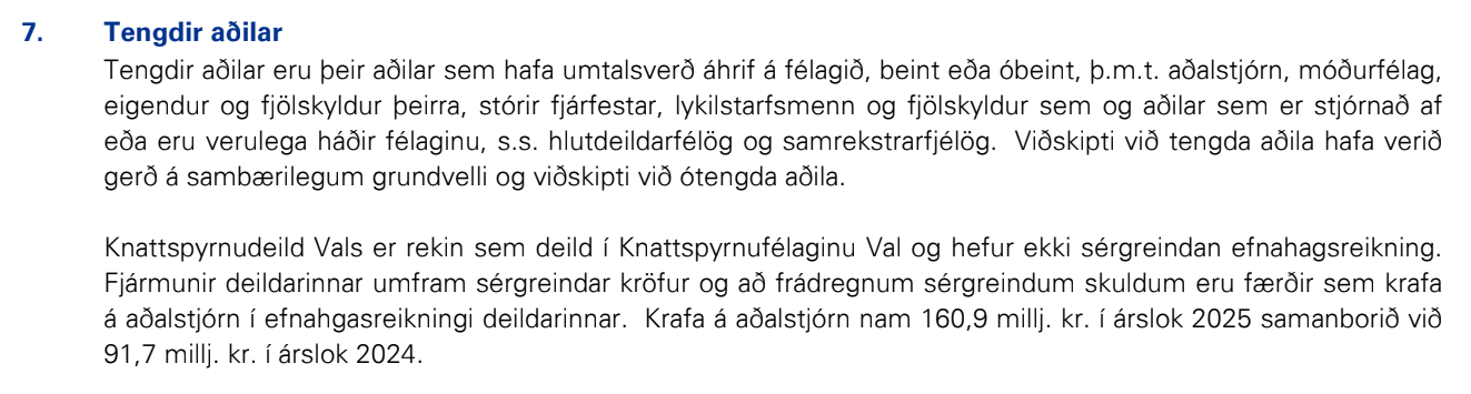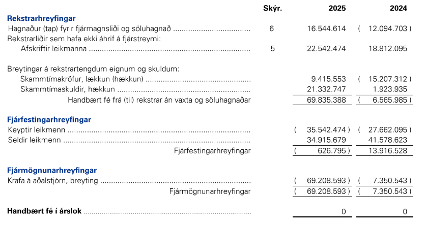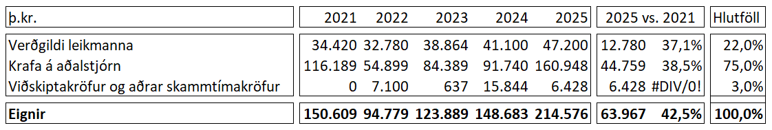 Eignir Vals stóðu í 214,6 milljónum króna í árslok 2025 og hækkuðu um ríflega 66 milljónir króna á milli ára. Stærsta eign Vals er krafa á aðalstjórn sem er 161 milljón króna. Þetta er í raun handbæra fé Vals. Í skýringum er tekið fram að knattspyrnudeildin er rekin sem deild innan félagsins og hefur því ekki sérgreindan efnahagsreikning. Í sjóðstreymisyfirlitinu er líklega áhugaverðasti punkturinn sá að félagið keypti leikmenn fyrir samtals 35,5 milljónir króna á síðasta ári.