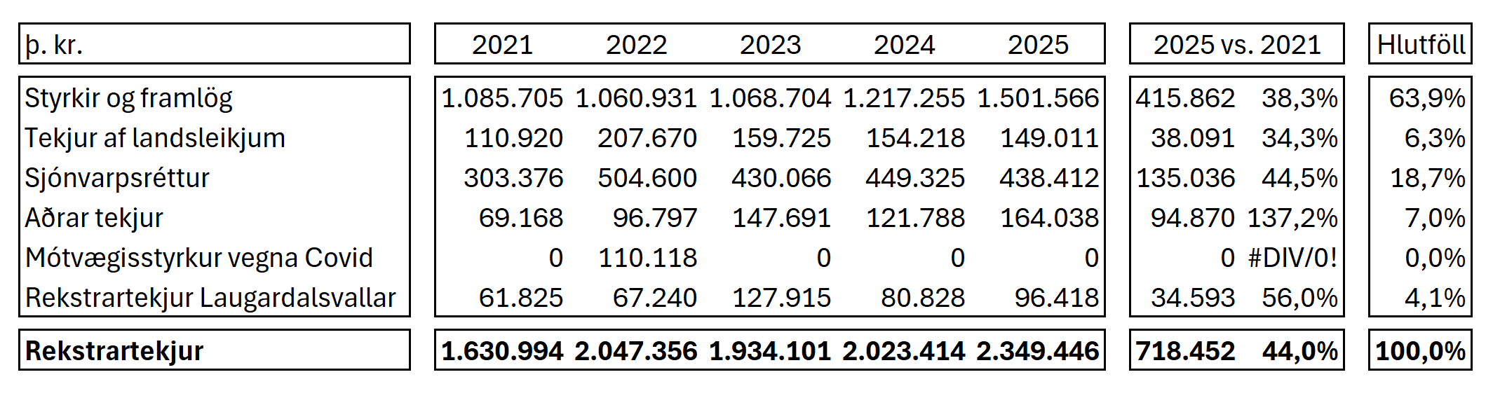 KSÍ velti 2.349 milljónum króna á síðasta ári en áætlanir KSÍ fyrir árið 2025 gerðu ráð fyrir 2.070 milljónum króna í rekstrartekjur. Árið áður, 2024, voru rekstrartekjur KSÍ 2.023 milljónir króna og því jukust rekstrartekjur um 326 milljónir á milli ára, tæplega 16,1% aukning. Stærsti hluta rekstrartekna KSÍ koma frá styrkjum og framlögum eða tæplega 63,9%. Þar á eftir er sjónvarpsréttur næststærsti tekjuliðurinn en hlutfall hans af rekstrartekjum KSÍ er 18,7%.