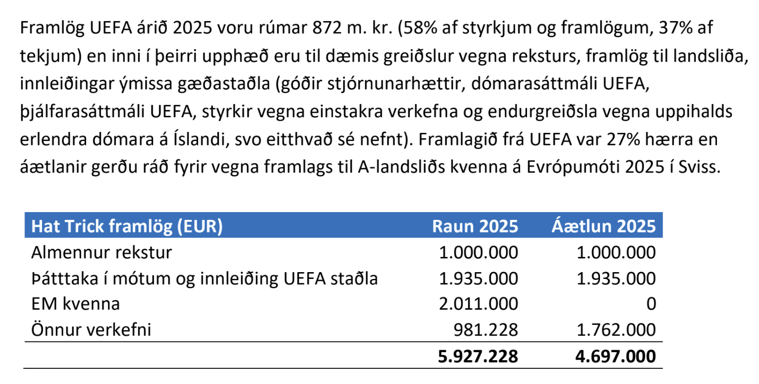 Í greinargerð sem KSÍ birti með ársreikningnum kemur fram að framlagið frá UEFA var 27% hærra en áætlanir gerðu ráð fyrir vegna þess að A-landslið kvenna komst á EM kvenna.