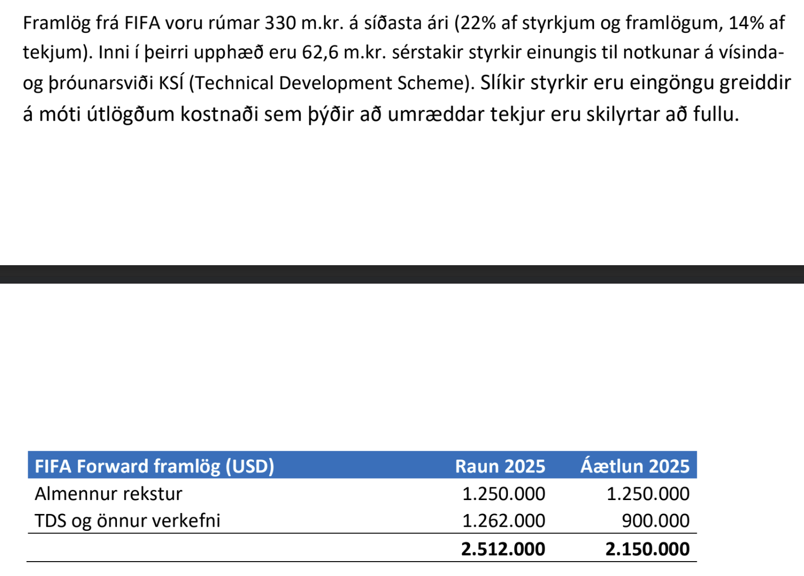 Þess ber að nefna að ýmis framlög frá UEFA og FIFA eru áætluð í ákveðin verkefni, og því ekki um frjáls framlög sem KSÍ getur ráðstafað að eigin vild. Í greinargerð ársreikningsins er meðal annars tekið fram að KSÍ fékk 62,6 milljón króna styrk frá FIFA sem var einungis ætlaður til notkunar á vísinda- og þróunarsviði KSÍ (e. Technical Development Scheme)
