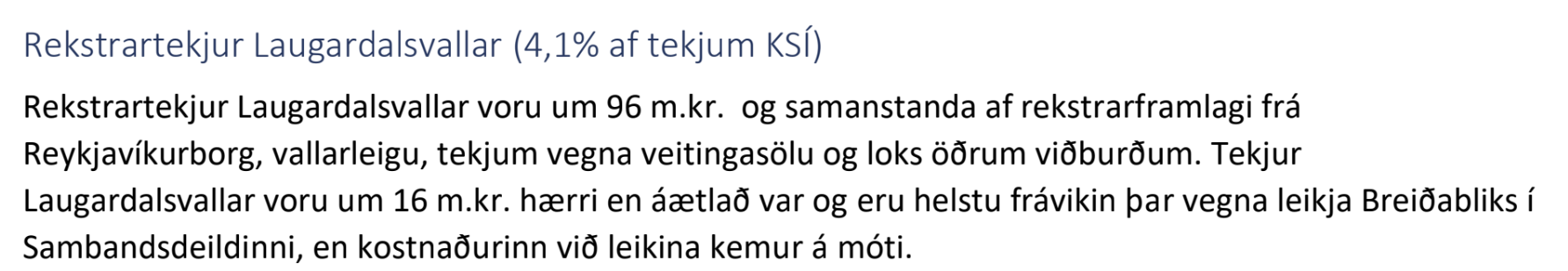 Rekstrartekjur Laugardalsvallar voru 96 milljónir króna á síðasta ári og hækkuðu um tæplega 15,6 milljónir króna á milli ára en það er aukning upp á 19,3%. Í greinargerðinni segir að þessar tekjur samanstanda af rekstrarframlagi frá Reykjavíkurborg, vallarleigu, tekjum vegna veitingasölu og öðrum viðburðum. Rekstrartekjur Laugardalsvallar voru hærri en áætlað var, aðallega vegna leikja Breiðabliks í Sambandsdeildinni.