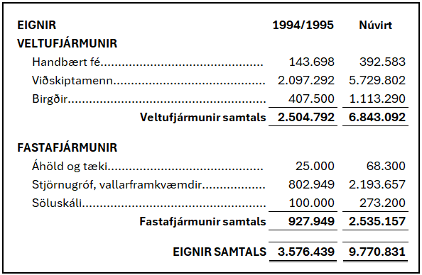 Til samanburðar þá voru eignir Víkings árið 2024 samtals 562 milljónir króna. Núvirtar eignir árið 1995 eru 1,7% af heildareignum Víkings árið 2024.
