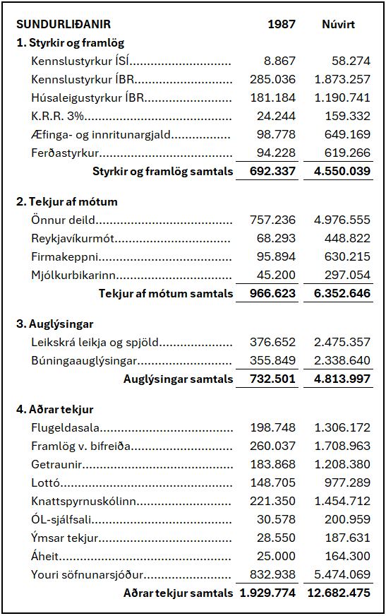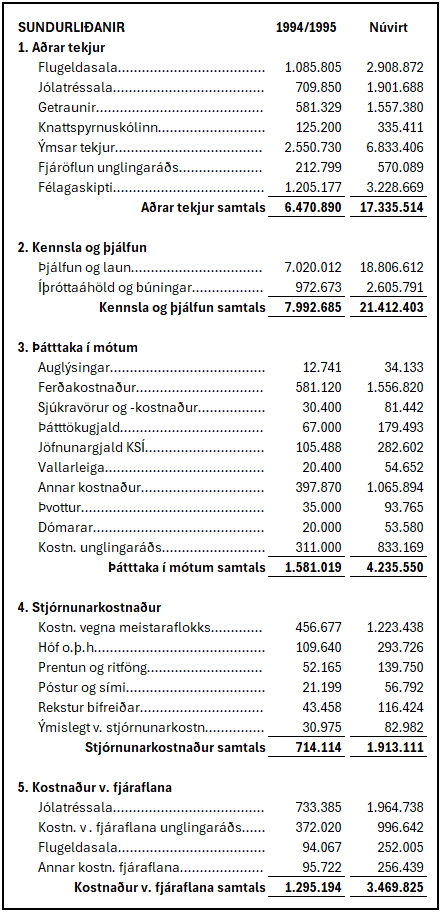 Alls konar áhugaverðar molir í skýringunum. Jólatrésalan endaði í tapi en það var bullandi hagnaður af flugeldasölunni. Félagsskiptatekjur árið 1995 voru 3,2 milljónir króna að núvirði en voru 5,5 milljónir króna árið 2024, ekki það mikill munur.