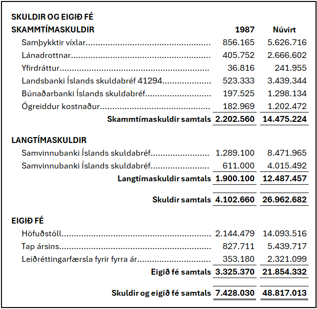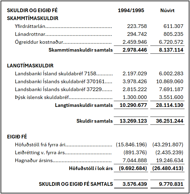 Skuldir Víkings árið 2024 voru rúmlega 62 milljónir króna samanborið við núvirtar skuldir upp 36 milljónir króna árið 1995, sem er nokkuð nálægt hvort öðru miðað við aðrar stærðir í þessum samanburði.