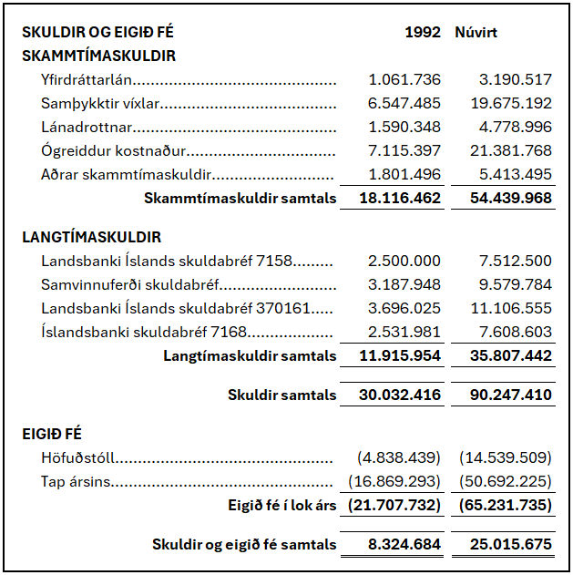 Skuldirnar árið 2024 voru 62 milljónir króna sem er rúmlega 28 milljón krónum lægra en það sem skuldirnar voru árið 1992 að núvirði.