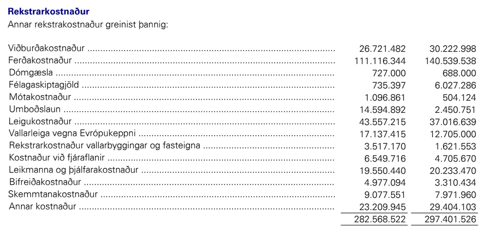 Annar rekstrarkostnaður var næststærsti útgjaldaliður Víkings árið 2025. Í skýringum ársreikningsins má finna sundurliðun á honum þar sem ýmis kostnaður kemur fram. Það áhugaverðasta er sennilega þær 17 milljónir sem Víkingur eyddi í vallarleiga fyrir Sambandsdeildina. Víkingur tók Bolt Arena í Helsinki á leigu fyrir viðureign þeirra gegn Panathinaikos í febrúar 2025. Árið áður hafði félagið tekið Kópavogsvöll á leigu fyrir heimaleiki sína í deildarkeppni Sambandsdeildarinnar, það kostaði 12,7 milljónir króna.