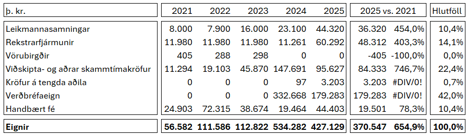 Eignir Víkings námu 427 milljónum króna í árslok 2025. Stærsti hluti eigna Víkings eru í formi verðbréfaeignar, eða tæplega 42,0%. Víkingur keypti upprunalega verðbréf árið 2024 en hafa, að því virðist, selt tæplega helming af því núna á síðasta ári. Viðskipta- og aðrar skammtímakröfur voru næststærsta eignin en þær námu 95,6 milljónum króna í árslok 2025. Rekstrarfjármunir eru þriðja stærsta eignin, en sú eign fimmfaldaðist á milli ára. Í skýringum ársreikningsins má sjá að Víkingur hefur keypt fasteign fyrir 50 milljónir króna á árinu.