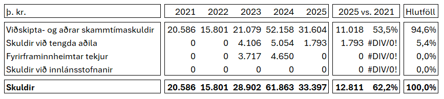 Skuldir Víkings stóðu í 33,4 milljónum króna í árslok 2025 og lækkuðu um tæplega 28,5 milljónir króna á milli ára. Skuldir Víkings eru að mestu viðskipta- og aðrar skammtímaskuldir sem námu 31,6 milljónum króna í árslok 2025.