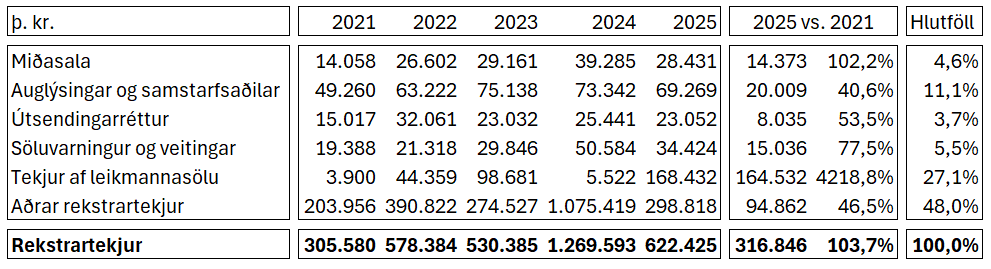 Á síðasta ári voru rekstrartekjur Víkings R. 622 milljónir króna sem er rúmlega helmingi minni rekstrartekjur en árið áður, en þó af góðum ástæðum. Árið 2024 fékk Víkingur vitaskuld gífurlega mikla peninga vegna góðs árangurs í Sambandsdeildinni og því var vitað að tekjurnar myndu lækka. Ef við tökum því árið 2024 út fyrir sviga þá má sjá að 2025 tölurnar hækka um 17,3% frá því sem var árið 2023. Stærsti hluti tekna Víkings árið 2025 er flokkaður undir öðrum rekstrartekjum, tæplega helmingur tekna ársins, en þar á eftir kom ríflega fjórðungur tekna vegna sölu leikmanna.