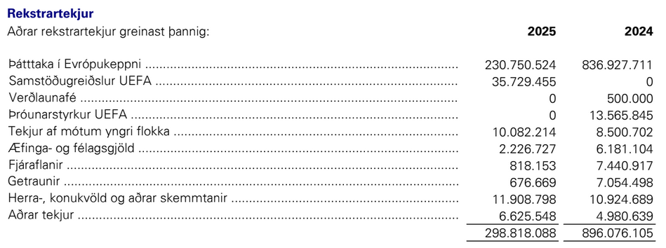 Knattspyrnudeild Víkings var rekin með tapi 100 milljón króna tapi árið 2025. Þetta er raunar nokkuð kunnuglegt stef frá því sem sást hjá Breiðabliki í ársreikningi þeirra árið 2024. Breiðablik tók þátt í Sambandsdeildinni tímabilið 2023/24. Ársreikningurinn fyrir árið 2023 sýndi myljandi hagnað en í 2024 ársreikningnum mátti sjá tap upp á tæplega 104 milljónir króna. Það sama virðist hafa gerst hjá Víkingi. Þeir tóku þátt í Sambandsdeildinni tímabilið 24/25. Ársreikningurinn fyrir árið 2024 sýndi myljandi hagnað en í 2025 ársreikningnum má sjá tap upp á tæplega 100 milljónir króna.
